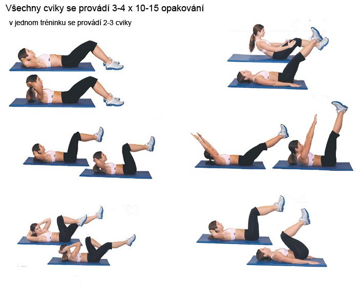 Прямые скручивания. Нужно лечь на спину, ноги согнуть в коленях и стопы поставить на пол. Руки завести за голову, не сцепляя пальцы. Теперь нужно поднимать верхнюю часть туловища, поднимая лопатки. Опускаясь, старайтесь не класть голову на пол, а держать ее на весу. Выполнить рекомендуется три подхода по 10 раз. Со временем количество подходов рекомендуется увеличивать.