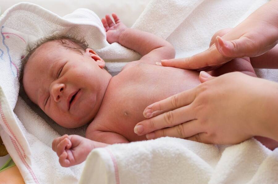- при пальпации чувствуется напряжение животика. Младенец с недовольством реагирует на прикосновения;