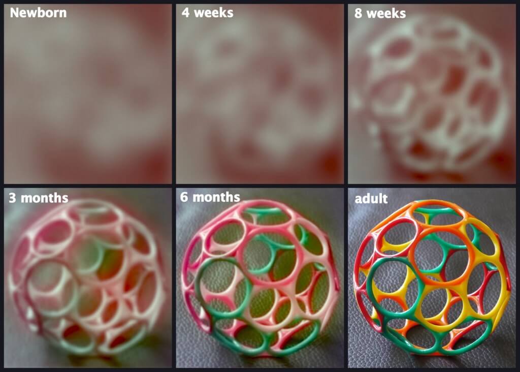 В этом видеоролике демонстрируют примерное изображение, которое может получить зрение у новорожденного в динамике по месяцам. Рассказано, что за чем учатся различать глаза крошки, которые к году уже не уступают в своих возможностях взрослому зрению.