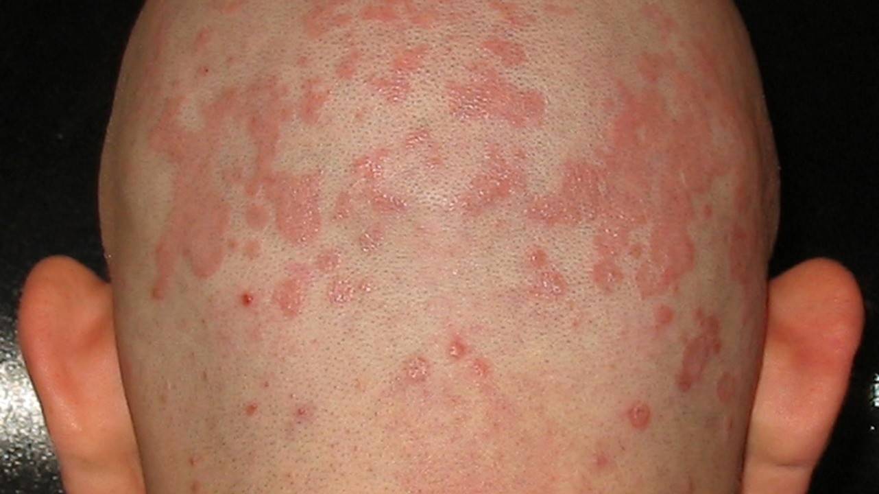 - Расширение области пораженных дерматитом участков, корочки появляются не только на голове, но и на других участках тела. При этом появляется зуд, кожа отекает и краснеет.