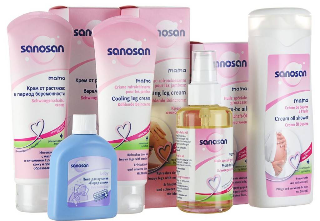 - Sanosan. Крем произведен в Германии. Использоваться он может в период беременности и во время лактации. Повышает тонус кожи и ее эластичность. Занимается профилактикой растяжек, с новыми дефектами средство, по отзывам женщин, не борется.