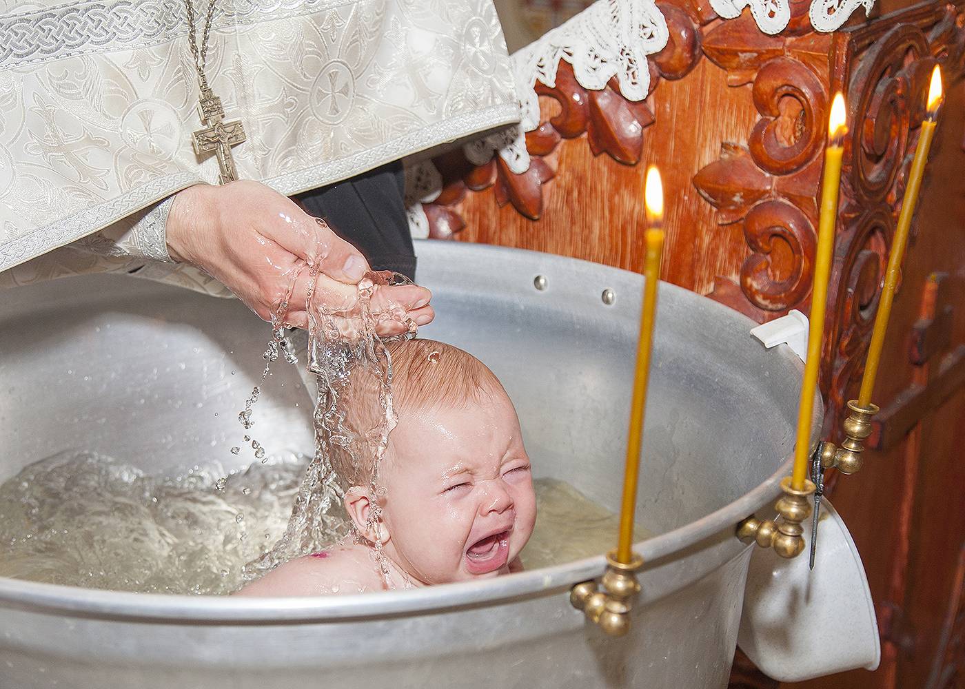 В одних церквях детей окунают в купель полностью. Чем младше ребенок, тем легче он переносит эту процедуру, так как еще помнятся рефлексы.