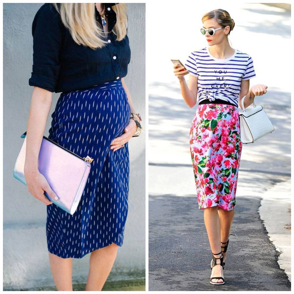 5. Юбка с принтом из тянущегося трикотажа – отличный вариант для беременных, особенно если она с рисунком в виде вертикальной полоски. Этот принт стройнит и визуально вытягивает силуэт. Приятный трикотаж нежно «обнимет» животик и подчеркнет интересную форму, не сковывая движений мамочки.