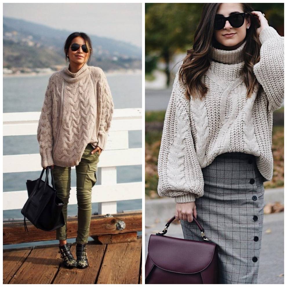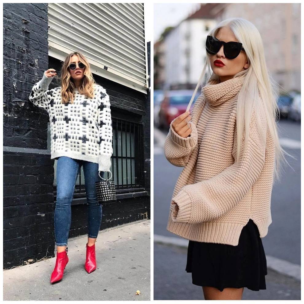 3. Свитер-оверсайз достаточно крупной вязки – то, что должно быть в гардеробе женщины, ожидающей малыша. Кстати, носить оверсайз можно и после рождения ребенка за счет универсальности фасона. Такая модель давно не выходит из моды. Этот свитер изумительно смотрится с юбками и брюками. Подходящая обувь – ботфорты и сапоги-казаки.