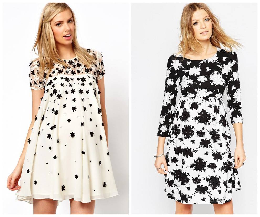 1. Свободное легкое платье в цветочек либо горошек – must have для будущей мамы. Платье миди длины будет красиво смотреться на фигуре. Зимой и осенью под платье можно надевать теплые колготки, носить его с удобными ботинками и комфортным пальто.