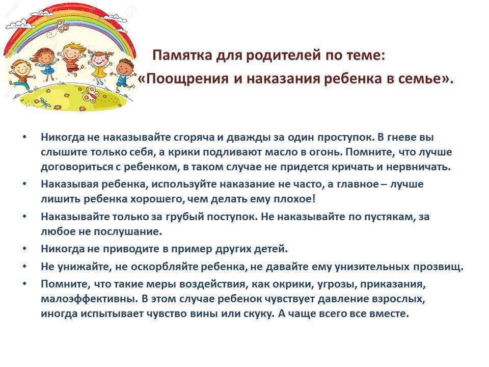 Правильное наказание должно стимулировать ребенка обдумать свой поступок или поведение и сделать соответствующие выводы, но ни в коем случае не унизить его, вызвать обиду, злость на родителей или чувство вины. Добиться этого можно, соблюдая следующие правила: