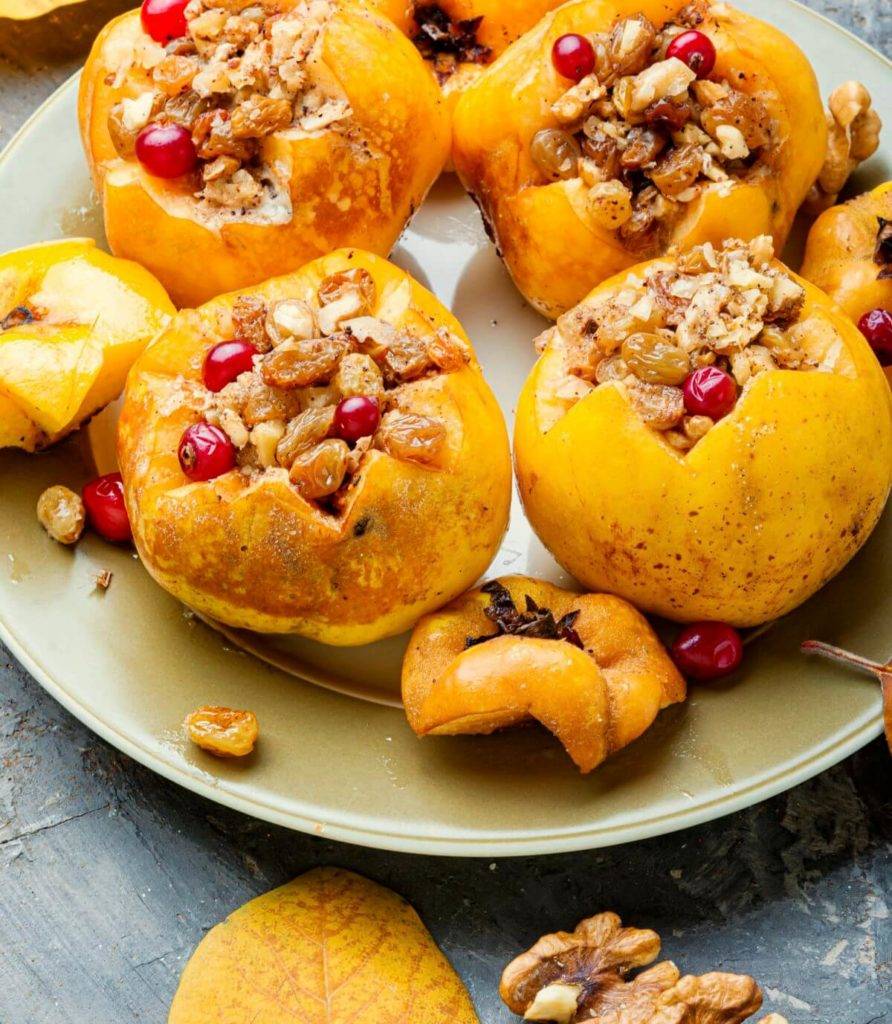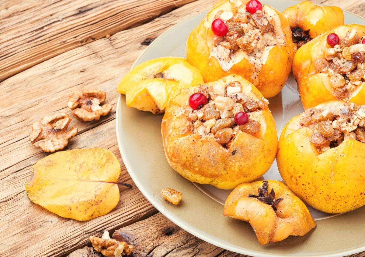 - Измельченные орехи соединить с медом. Айву вымыть, удалить сердцевину и семена, сделав углубления для начинки. Внутрь каждого плода поместить немного сливочного масла, начинить.