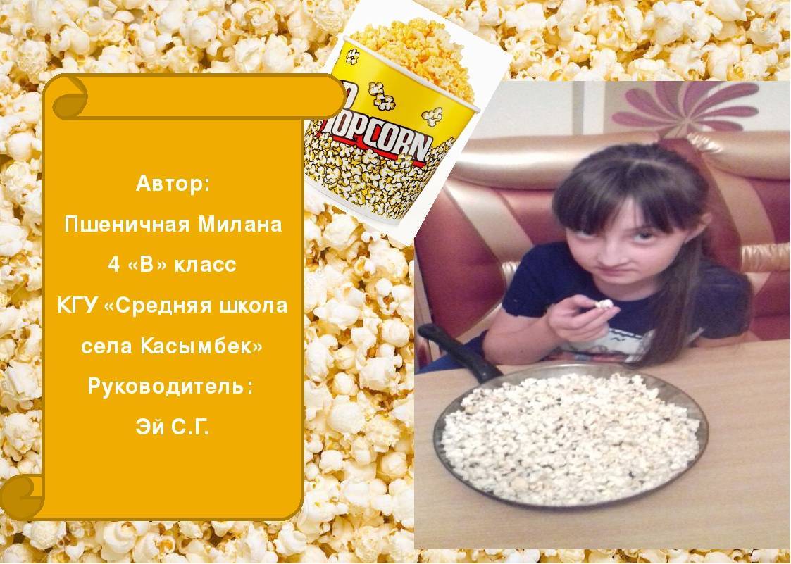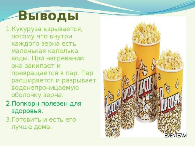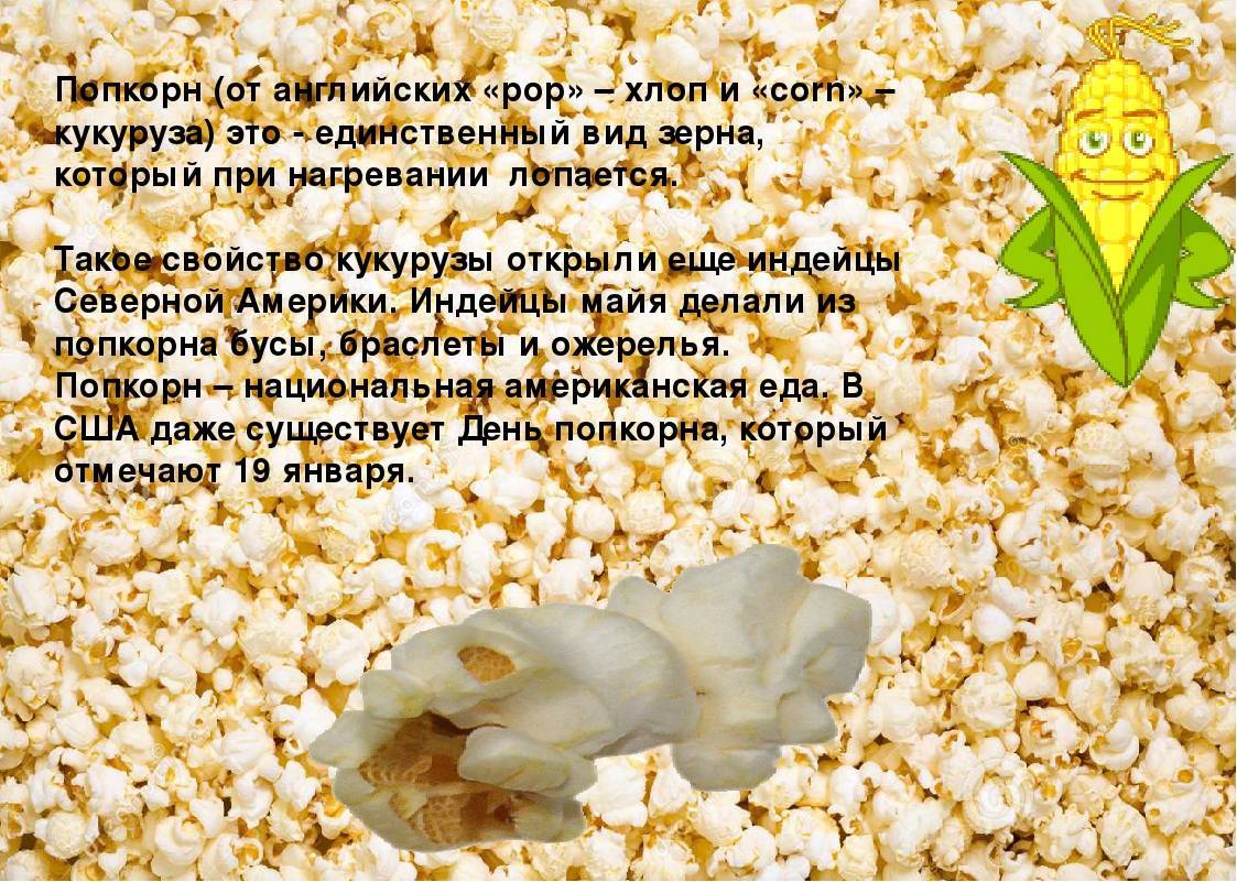 Попкорн готовят из кукурузы специального сорта, которая содержит в себе воду и крахмал. При нагревании до 200ᵒC такая кукуруза взрывается и выворачивается наружу, увеличиваясь при этом в размере.