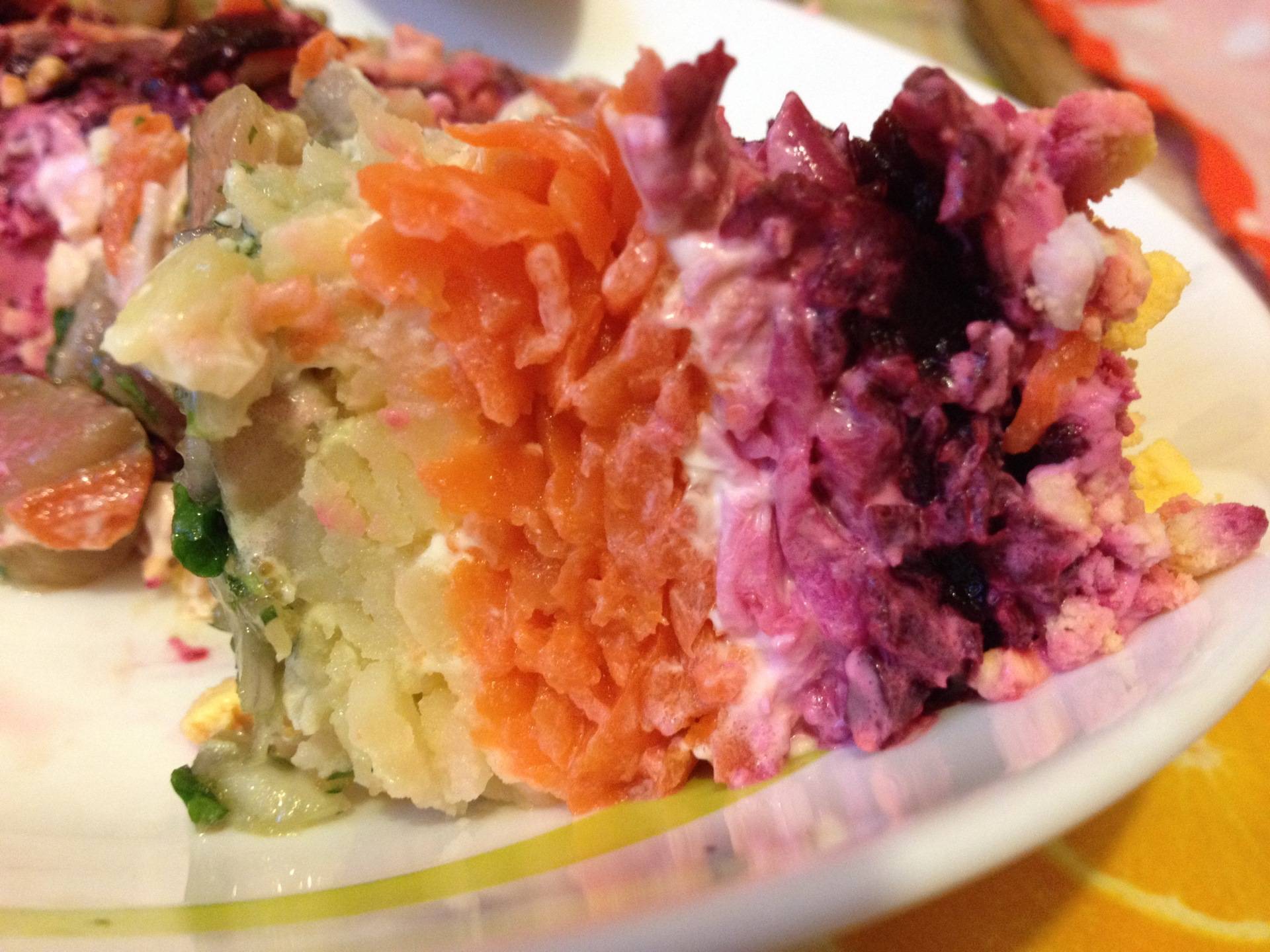 Сельдь нужно очистить от шкуры и костей, нарезать мелкими кубиками. Овощи следует натереть на крупной терке и уложить в блюдо слоями, чередуя их. Каждый слой можно промазать сметаной.