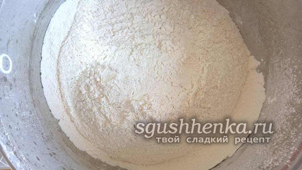 - 450 г муки соедините с чайной ложкой соли, аналогичным количеством соды и щепоткой лимонной кислоты (до трети чайной ложки). Иногда кислоту заменяют соком лимона – предварительно разведите его водой и вливайте в тесто.