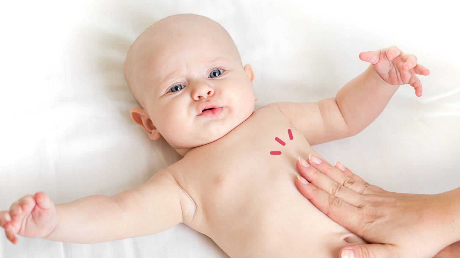 При массаже основание ладони слегка упирают в нижнюю часть живота ребенка и вращают пальцы по часовой стрелке, осторожно поглаживая животик