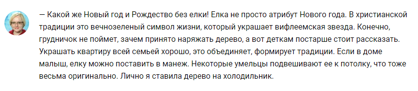 Состояние мамы. Запишите заранее те события, которые вас сильно напрягают на праздниках и, наоборот, расслабляют и гармонизируют, и выстроите свой Новый год с учетом этих пунктов. Помните, что отдых для мамы после родов, исключение поднятия и ношения тяжестей, регулярное питание, отказ от спиртного — это залог легкого и радостного праздника. Очень часто эко-семьи справляют Новый год только в компании друг друга и малыша, зная, что крохе будет очень неприятно в первые дни после рождения оказаться в шумном, незнакомом мире, с новыми запахами, звуками, с мамой, пахнущей непривычно. А посещение мероприятий и походы по гостям можно равномерно распределить до Нового года и после, в январские праздники.