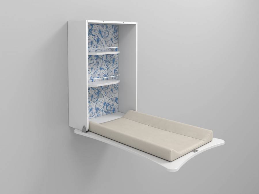 Данная модель крепится непосредственно к стене. В неработающем виде полностью прижимается к стене. По необходимости, пеленальная доска ставится в рабочее положение. Под ней обычно имеется маленький сталлаж для самых необходимых детских вещей.