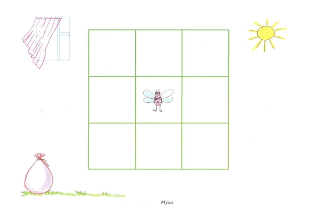 Если ребёнку трудно, сыграйте с ним в «Муху». Расчертите лист на девять квадратов. Отдельно нарисуйте муху, вырежьте и положите в центральный квадрат. Давайте команды: «Муха ползёт вниз!», «Теперь влево!», «Вверх!» Ребёнок должен перемещать муху в соответствии с указаниями. Если всё получилось, муха ловится в мешок. Если перепутал команды, она улетает в форточку.