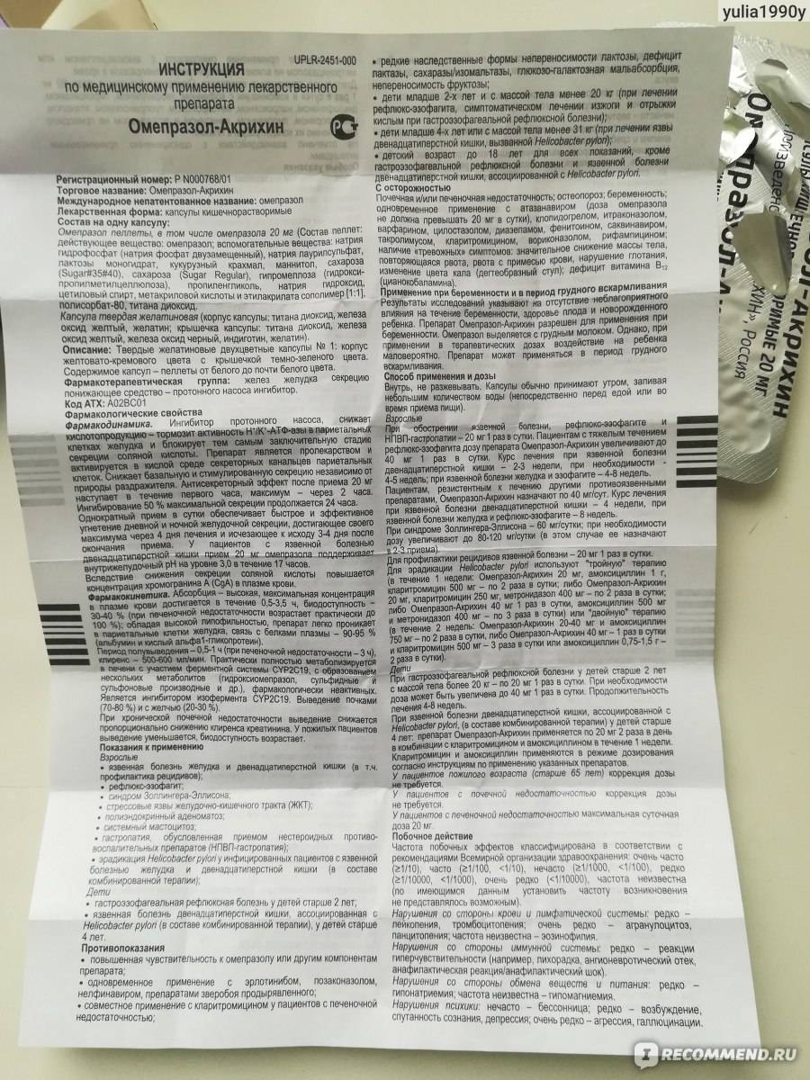 При терапии Омепразолом женщине надо соблюдать следующие правила: