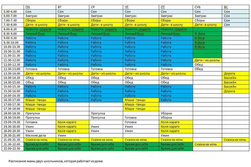 Когда всё организованно, мама успевает отдохнуть в промежутках, когда детвора спит или мирно играет. А когда один просит есть, другой помочь с уроками, а третий просто канючит, чтобы обратить на себя внимания, то вся эта круговерть начинает сводить с ума. В такой каше вариться тяжело как маме, так и детям. Разумеется, когда дети вырастают, они начинают жить в собственном ритме, навязывать им какой-то график бесполезно и несправедливо, но малышей и школьников вполне возможно и целесообразно приучать в одно и то же время ложиться спать, есть, вставать утром и т.д.