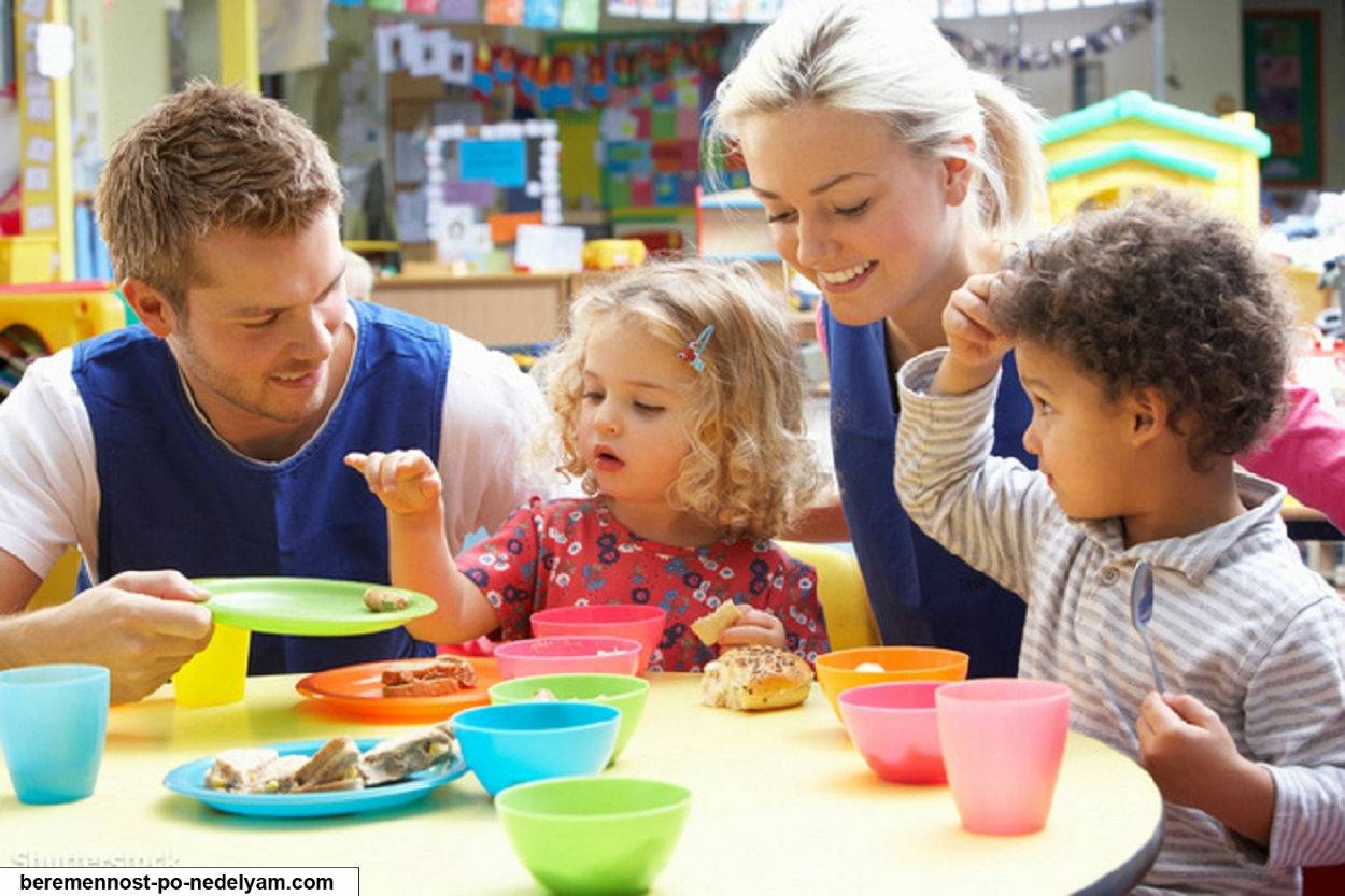 Во время нахождения детей за столом на них не следует обращать особого внимания, не говорить ему как есть маленькие крупицы, не уговаривать есть и не стараться запихнуть пищу силой. В первый день ребенка сажают за стол к маме на колени раз в день, затем количество приемов пищи увеличивают до 5–6 раз в сутки. Особой рекомендации по вводу продуктов нет, дети не находятся за столом, чтобы наесться, они знакомятся с пищей, пробуют и выбирают по вкусу.