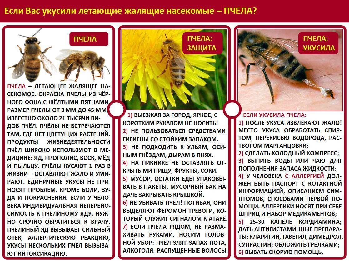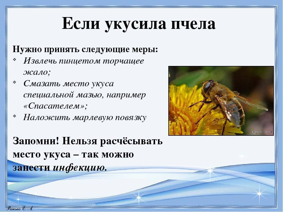 Что делать при укусе: жало пчелы нужно вытащить пинцетом или иголкой, остальные обидчики уносят его с собой, потому ковырять ранку не стоит. Промываем место укуса холодной водой, после – антисептиком (подойдет йод, зеленка, спирт, перекись водорода). Затем прикладываем пакет со льдом для уменьшения боли и замедления действия яда. Следует дать ребенку противоаллергический препарат и обеспечить обильное питье.Если под рукой нет лекарств и дезинфицирующих средств, место укуса можно обработать соком петрушки, лимонной кислотой или уксусом. Боль поможет снять млечный сок одуванчика. И при первой же возможности покажите отпрыска врачу, особенно если укус был в область лица или же «нападение» совершено целой компанией насекомых – нельзя исключить токсическую реакцию организма. Наблюдается рвота, понос, тошнота, судороги или потеря сознания – срочно вызывайте скорую помощь.