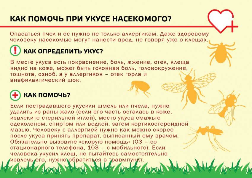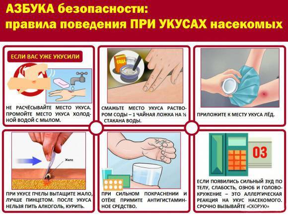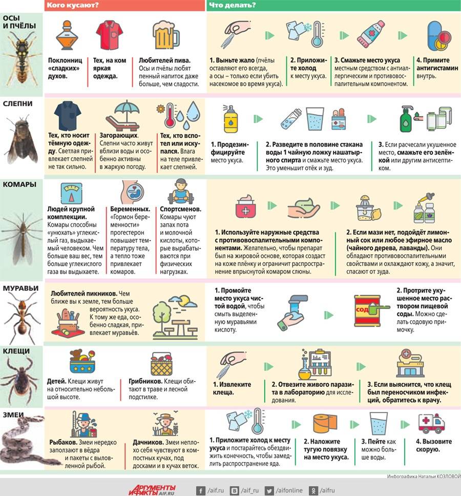 Что делать при укусе: нужно подержать на месте укуса что-то холодное, например, лед из морозилки. Поврежденное место смазываем противоаллергической, а затем противовоспалительной мазью или антисептиком. И следим, чтобы поврежденный участок тела был прикрыт одеждой – заклеивать пластырем не стоит, но и грязь туда попадать не должна. Также по совету врача можно принять антигистаминный препарат. На будущее – запасайтесь репеллентами, которые призваны отпугивать насекомых. Выбор велик, их выпускают и без резкого запаха, который многим не нравится.