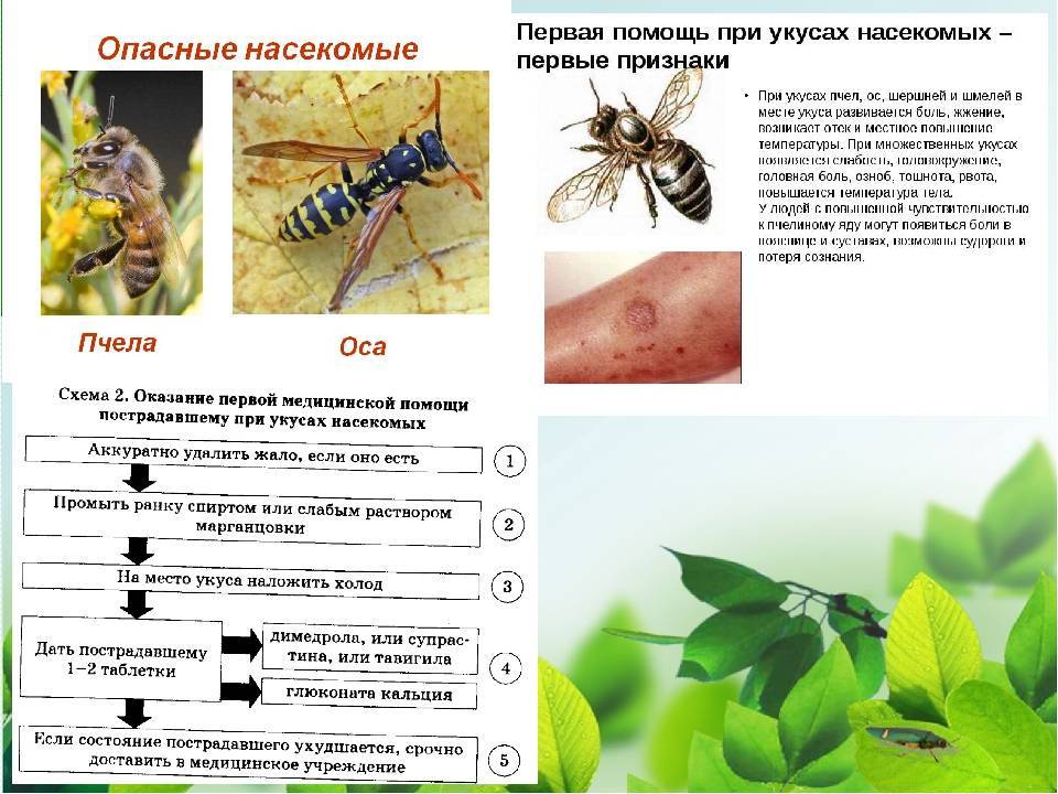 Кусают довольно редко, но выделяют яд, способный спровоцировать покраснение и опухание кожи, а также сильный зуд. Первая помощь после укуса такая же, как и в случае нежелательной встречи с вышеупомянутыми насекомыми.Не забывайте о том, что аллергикам на пикниках и делать нечего без назначенных врачом лекарств, которые всегда должны быть у взрослых под рукой. Также нельзя забывать и об антисептиках. Они могут пригодиться не только при укусах насекомых, но и при других травмах, которые легко получить на речке, в лесу или в саду, где так любят лазить по деревьям дети.