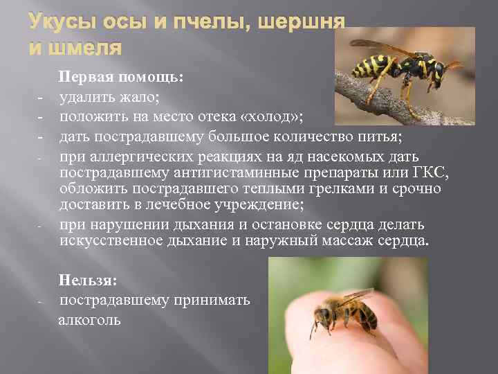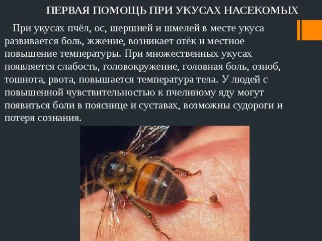 Особенно болезненны укусы ос и шершней. Они могут вызвать сильный отек и боль. Чтобы снять эти симптомы, приложите к укушенному месту лед или смоченную холодной водой салфетку.
