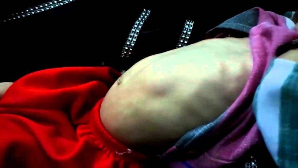 - характерным признаком служит сокращение мышечных тканей живота в форме «песочных часов», возникающее при поглаживании кожи в этой области, визуально заметное. Интенсивнее этот признак проявляется, если незадолго ребенок выпил небольшое количество воды.