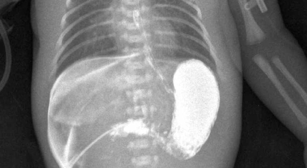 Также дополнительным методом исследования является рентгеконтрастирование – пассаж бария по ЖКТ. Хотя рентгенологическое исследование несёт лучевую нагрузку, оно является информативным и позволяет точно определить проходимость привратника. Ребёнку через рот даётся около 30 мл контрастного вещества (5% взвеси бария в грудном молоке или 5% растворе глюкозы). Обзорная рентгенография брюшной полости выполняется через час и четыре часа, после дачи контраста. При пилоростенозе на снимке будет определяться большой газовый пузырь желудка с одним уровнем жидкости. Эвакуация контраста из желудка в двенадцатиперстную кишку замедлена. После проведения обследования желудок необходимо опорожнить, чтобы при последующей рвоте предотвратить аспирацию бария.