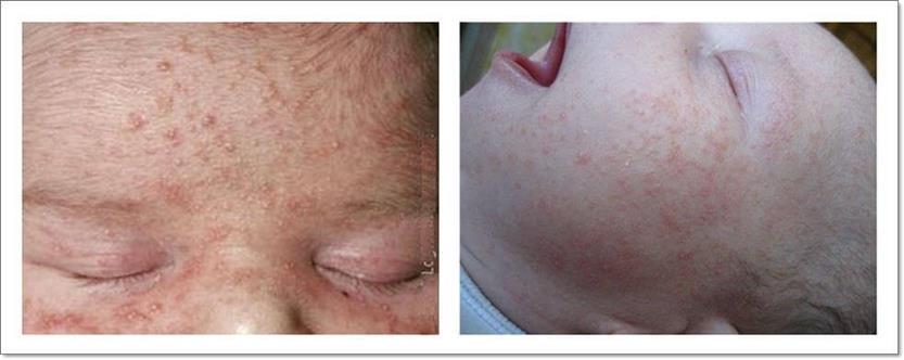 - пустулы, окруженные зоной гиперемии чаще на лице, реже на плечах, груди, возникающие в течение 2-3 недели жизни.