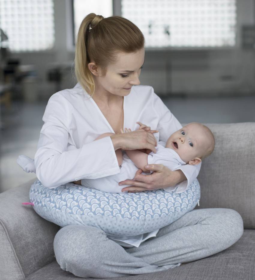 Использование специальной подушки поможет маме расслабиться в процессе кормления и не напрягать позвоночник. Новорожденного можно комфортно разместить в выемке подушки, таким образом, чтобы тело соприкасалось с мягким изделием.