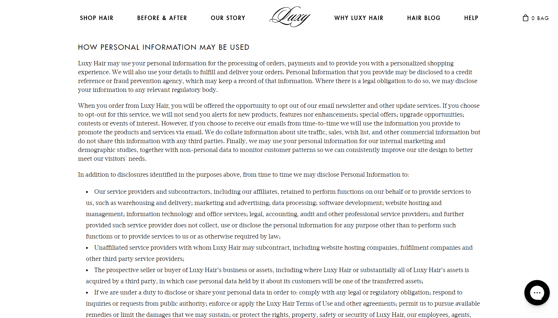 В магазине Shopify Luxy Hair есть хороший образец политики конфиденциальности, когда дело доходит до объяснения того, как может быть использована личная информация клиента: