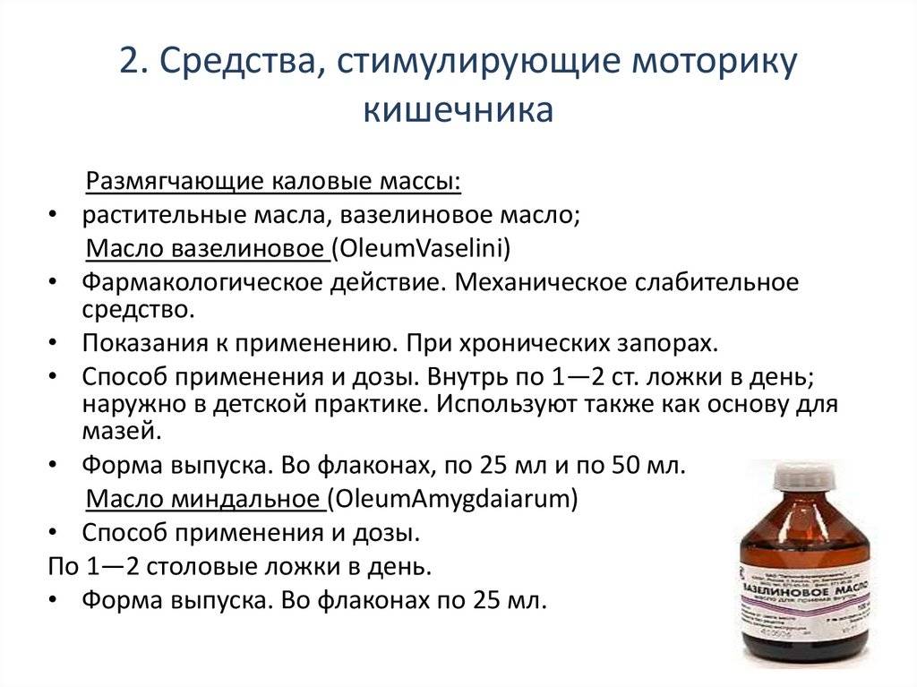 Вазелиновое масло, попадая в кишечник, не всасывается, а обволакивает его тонкой пленкой, выходя наружу в неизменном виде. Оно мягко стимулирует сокращение кишечных мышц и обеспечивает продвижение содержимого кишечника, опорожняя его.