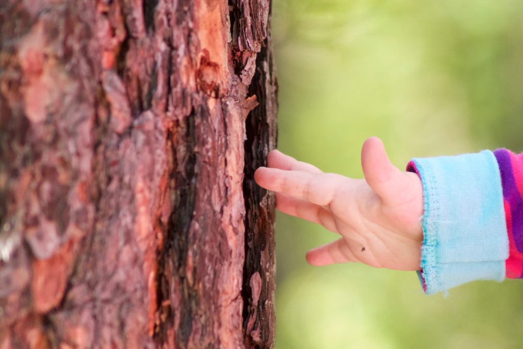 Игра на тактильное восприятие. Завяжите глаза и давайте ребенку щупать разные окружающие предметы и угадывать, что это: камень, ствол дерева, мох, перила лестниц.