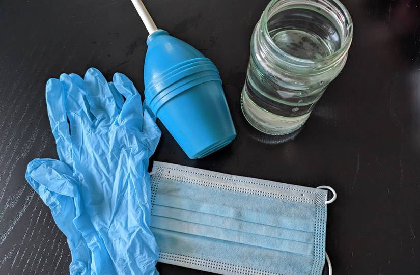 - Одеть мокрую марлевую повязку на лицо (или приспособить кусок ткани) для защиты легких, а также резиновые перчатки на руки (желательно медицинские, плотно облегающие – в хозяйственных перчатках будет неудобно совершать тонкие манипуляции).