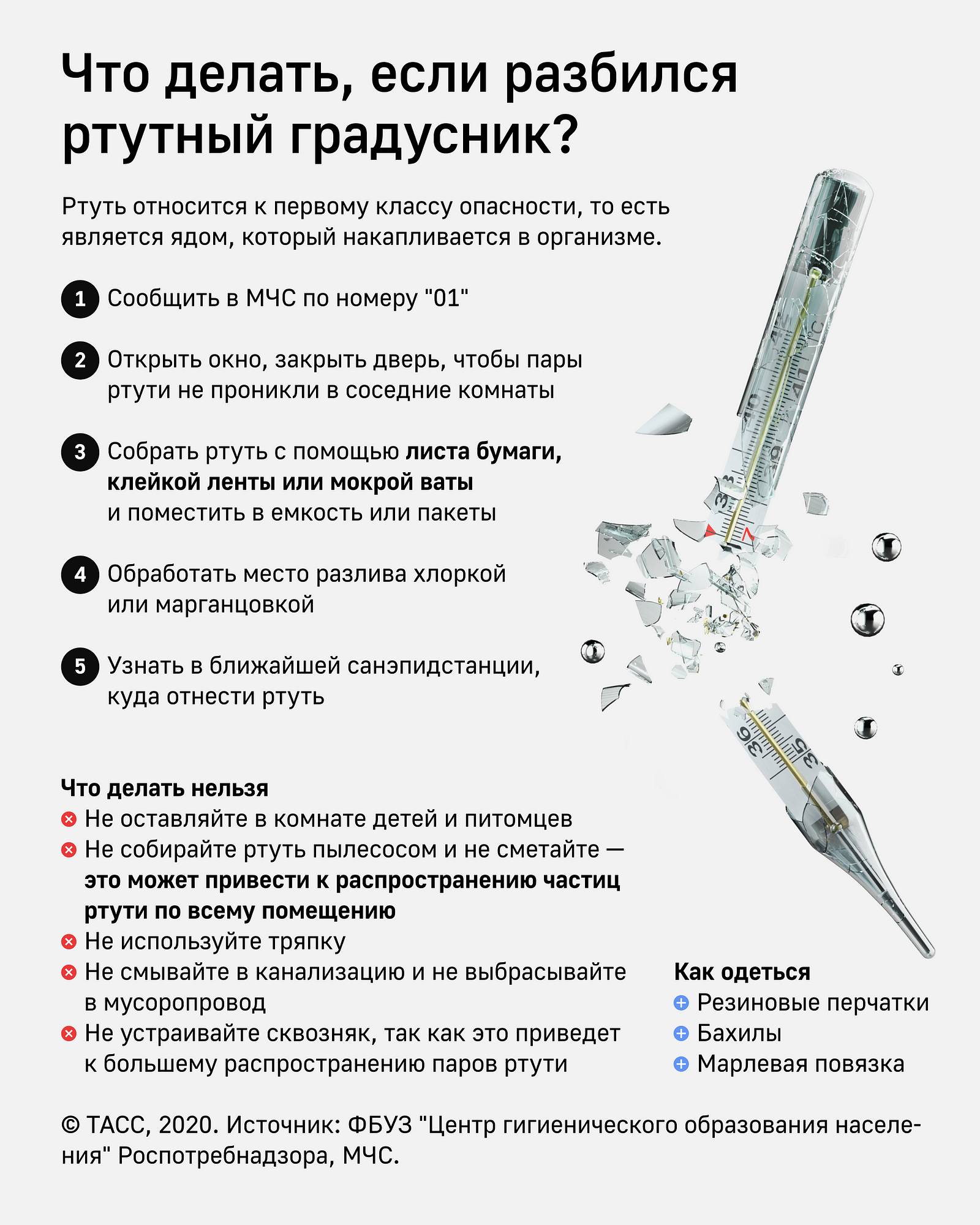 Что делать если разбил градусник с ртутью в первую очередь — это не трогать его и не пытаться сразу поднять, а вначале тщательно осмотреть место происшествия. Возможно, стеклянный корпус градусник только треснул или надкололся, и ртуть не вытекла.