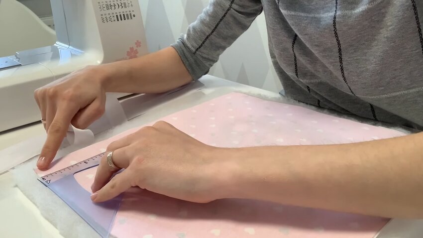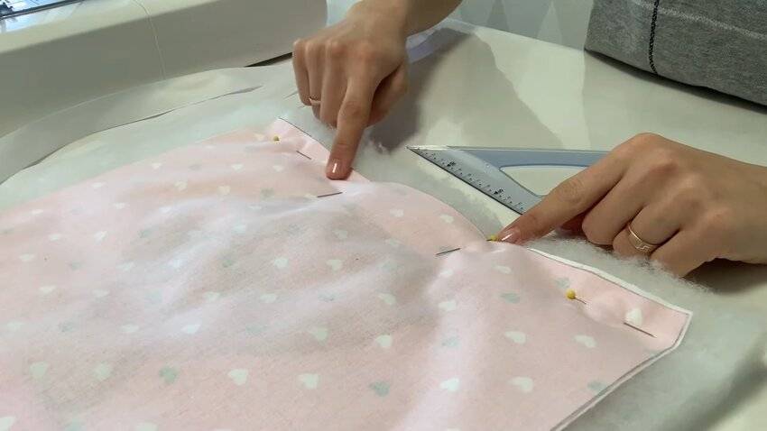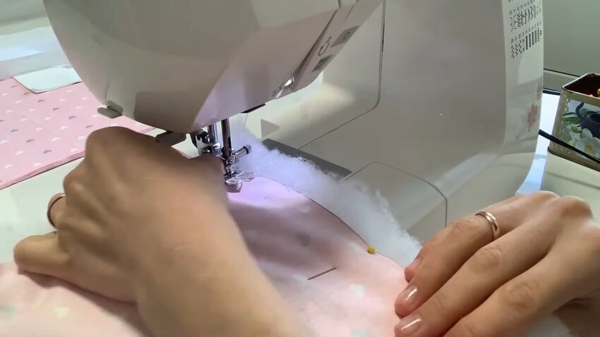 - Заколите булавками незашитый край изделия, застрочите его. На расстоянии 4 см от края борта проложите строчку через все слои материала (по лицевой части). Так наполнитель не собьется при стирке.