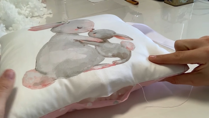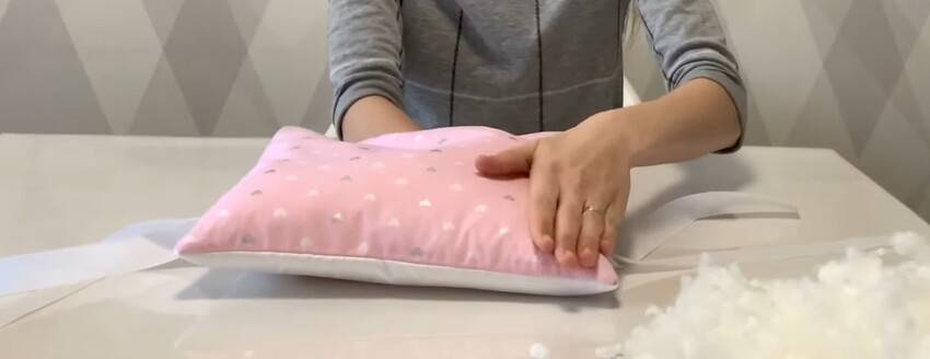 Перед началом работы отрез ткани следует постирать или обработать парогенератором, чтобы она дала усадку. Проще всего шить подушки без чехлов. Сначала вырезаются необходимые детали, а также режется наполнитель. Полученные детали из ткани складывают лицевой стороной внутрь и прострачивают полностью три стороны, а четвёртую только на 5-7 см