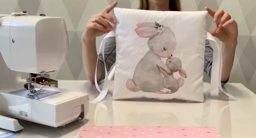 от каждого угла. При этом важно не забыть пришить ленты или завязки, которые будут крепить подушку. Ленты вшиваются сразу, поэтому перед соединением деталей их располагают на своих местах и скрепляют булавками или парой стежков. Для надёжности места крепления прошивают на машине ещё раз