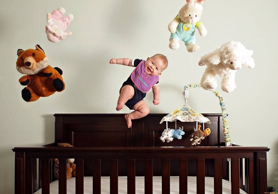 - Когда малец подрос и уже может стоять на ножках в кроватке или манежке, то нужно быть начеку. В любой момент он может опрокинуть манежку или перевернуться самому, стоит ему только потянуться за любимой соской или игрушкой внизу.