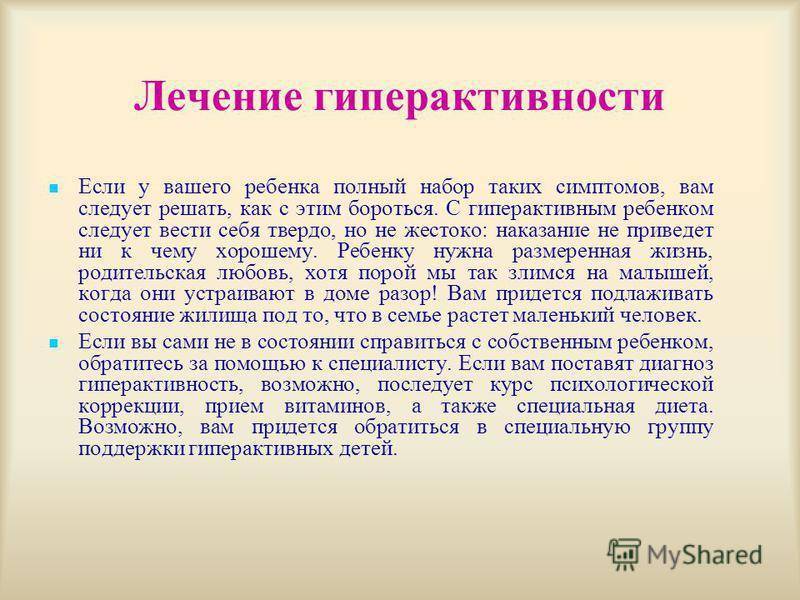 Помните, что не существует единого руководства по обучению и воспитанию гиперактивных детей. Любая методика индивидуальна и должна пересматриваться при отсутствии реакции ребенка.
