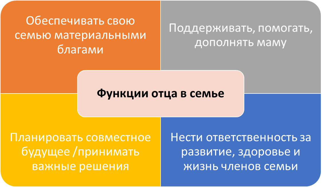 Роль мужа и отца в современной семье в первую очередь заключается в обеспечении ребенка чувством безопасности. Главная задача отца — гарантировать надежность, защиту. Ребенок ощущает это, как буквальную поддержку за спиной. И если по каким-либо причинам он не получает ее, он чувствует себя незащищенным, уязвимым перед огромным и небезопасным миром. Теряется серьезный энергетический ресурс, так как семья остается без родовой, мужской, отцовской «подпитки».
