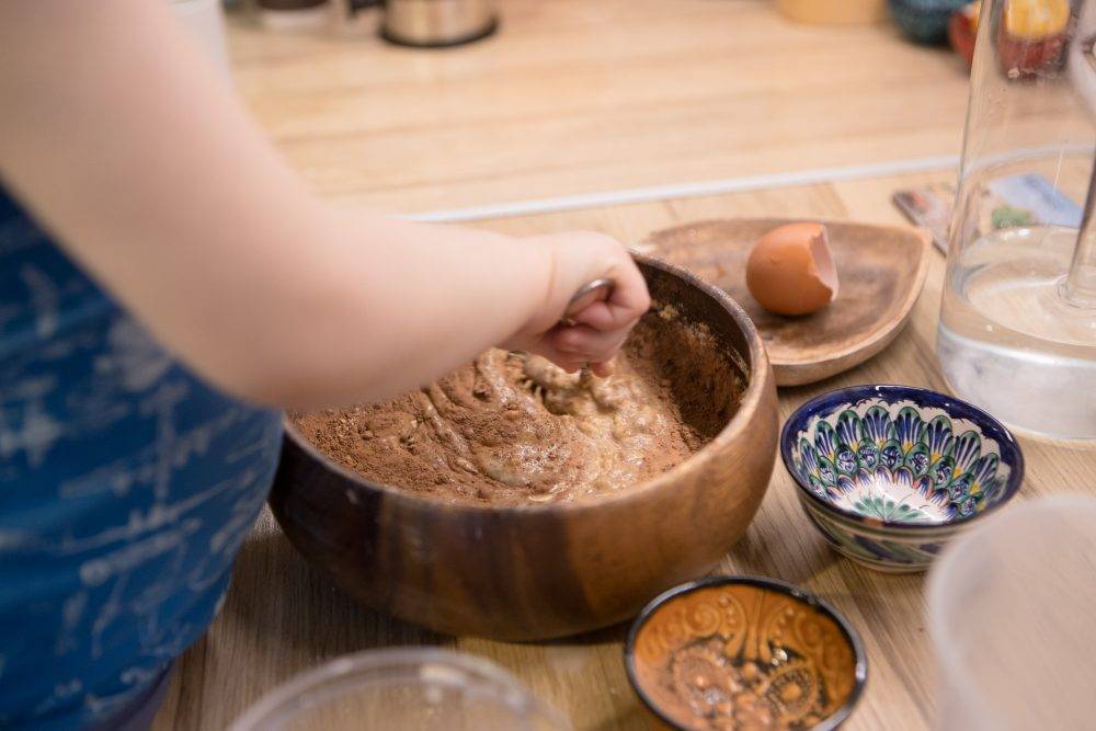 Потом сын добавляет молоко, какао и муку и снова всё перемешивает венчиком до консистенции жидкой сметаны. При желании можно добавить соль и сахар, но мы готовим без них