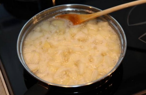 После этого, разумеется, посудина ставится на плиту — грушу нужно термически обработать, то есть сварить. Небольшой лайфхак для хозяюшек: изначально нужно дать воде закипеть, и лишь после этого в нее можно опускать кубики.