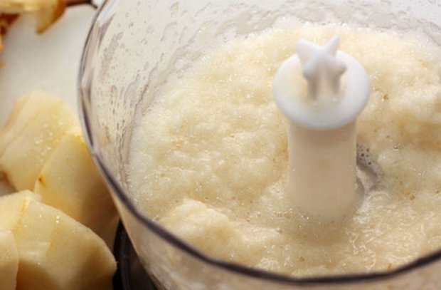 Затем засыпьте их в контейнер от блендера, чтобы перебить до пюреобразного состояния. За неимением блендера воспользуйтесь мясорубкой. Если же и это приспособление вам недоступно, воспользуйтесь обыкновенной вилкой. Чтобы избежать комочков, можете перетереть размятую вилкой грушу еще через ситечко.