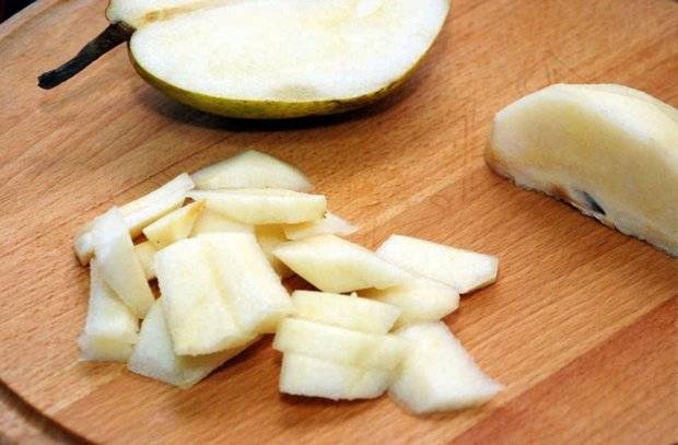 Сначала фрукт следует хорошо вымыть, затем снять с нее кожицу и достать семечки. После этого фрукт нужно разрезать на небольшие кубики. Подготовленную грушу сложить в емкость (ковшик, кастрюлька), добавить немного воды, и доведя до кипения, проварить 8-10 минут. Затем при необходимости грушу дополнительно можно измельчить. Если масса густая, стоит добавить часть воды, той самой, что использовалась при варке фрукта.