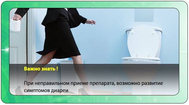 При игнорировании рекомендаций доктора и приеме большего количества вещества развивается диарея, которая постепенно ведет к обезвоживанию организма. Пациент жалуется на увеличение частоты сердечных сокращений, сухость кожного покрова и слизистых оболочек, боли в животе, при тяжелом течении не исключается нарушение сознания.