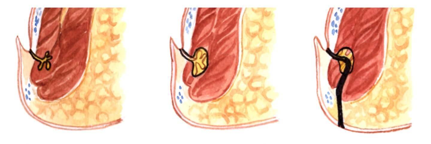 Рисунок 2. Этапы формирования свища: а) – анальная железа с выводным протоком, б) – воспалительный процесс в железе, с формирующимся абсцессом (гнойником) в) – сформировавшийся свищевой ход.
