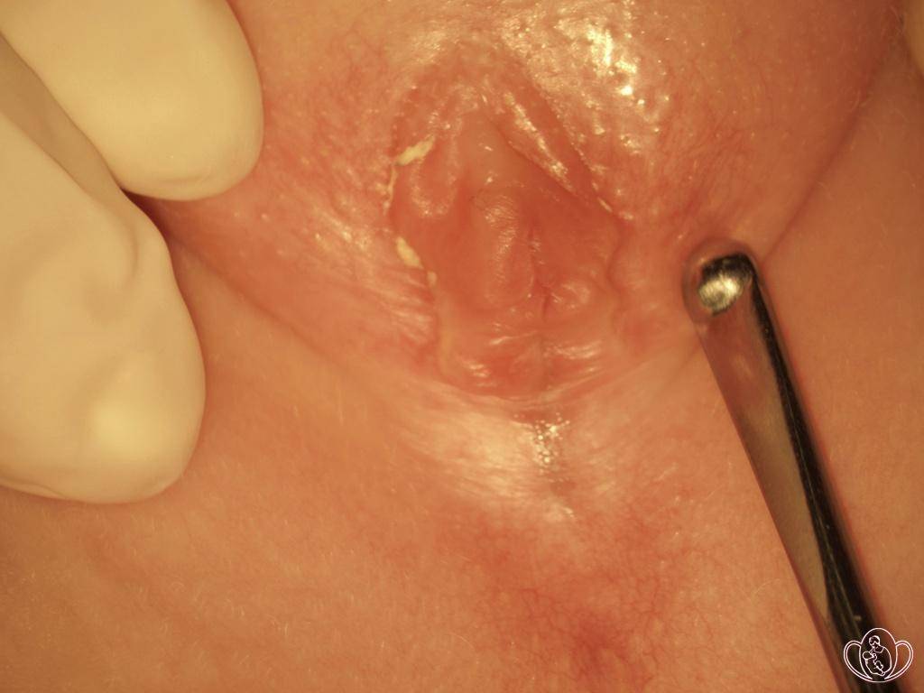 - Вход во влагалище перекрыт пленкой. При полных синехиях не видно даже отверстия мочеиспускательного канала.