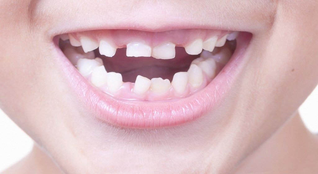 - Выпадение зубов переднего ряда – возникает при сильном воспалении дёсен, пульпите, сахарном диабете. В таких случаях ортодонт ставит ребёнку временные протезы, чтобы челюстно-лицевой аппарат формировался нормально. Когда процесс смены зубов закончится, врач произведёт замену на постоянные импланты.