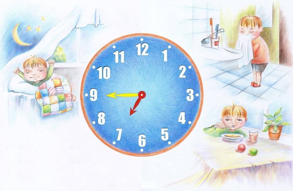 1) 9.00 — подъем 2) 9.30 — завтрак 3) 10.30-12.00 — прогулка 4) 12.30 — обед 5) 13.00-16.00 — сон 6) 16.30 — полдник 7) 17.30-18.30 — прогулка 8) 19.00 — ужин 9) 21.00 (21.30) — ночной сон 10) ночное кормление по требованию (дети до полутора лет)