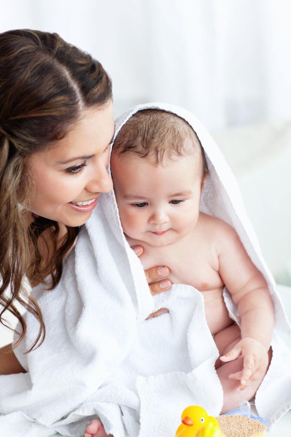 По рекомендациям европейских педиатров сразу после купания ребенка нужно не одеть, а укутать3. Укутывание предотвращает резкое снижение температуры тела в первые 10 минут после купания, при этом малыш все еще может ощутить телесный контакт с мамой3.